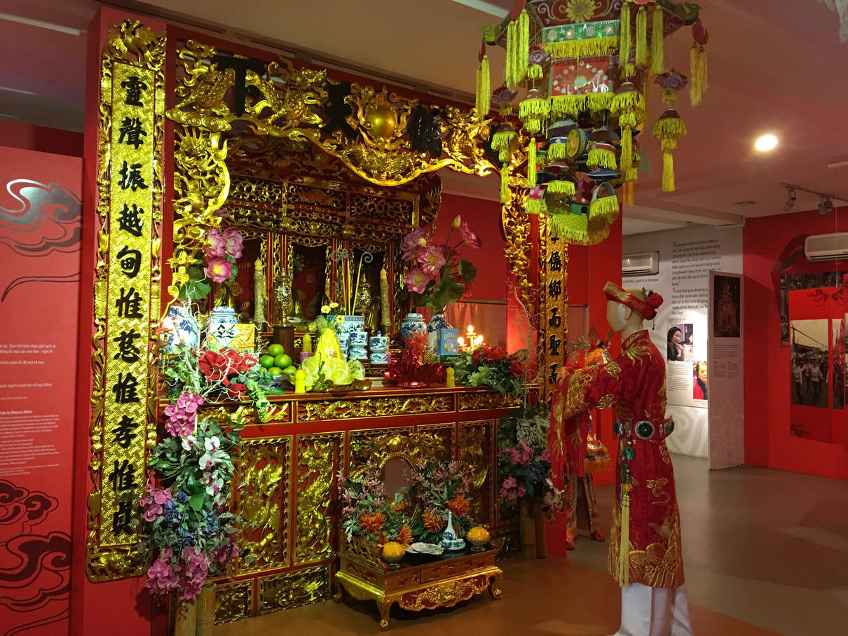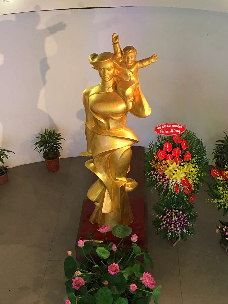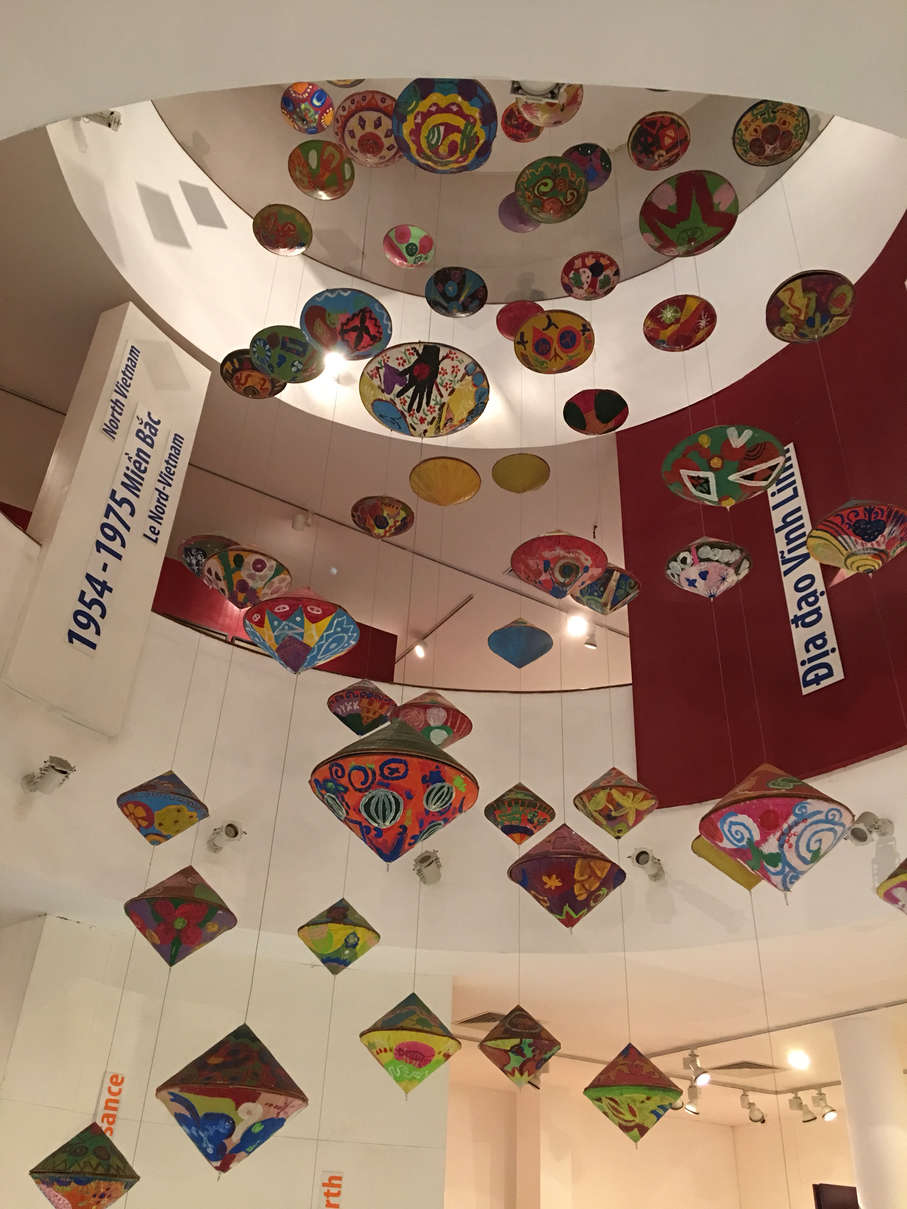 Our first stop was the Vietnamese Women’s Museum. For the admission price of 33000VND (~$1.45 USD), we got a fairly in-depth, five floor walk through of wedding customs of various regions, fashion, women in the revolution, the Mother Goddess, and more. Definitely worth a visit. (Pictured: Statue in entrance lobby of museum, hat art, costumes of the Mother Goddess ritual outfits, Mother Goddess altar)
