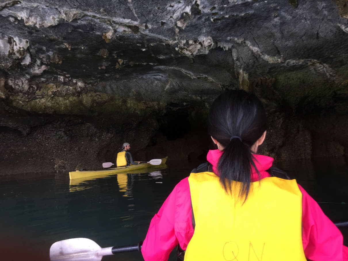 Big meal means more kayaking to work off that meat, and this time we went into a small cave, which was a challenge for many as it was very shallow, so much so, I could reach down and touch the floor. We got stuck, and as the title stated, and we had to thrust our way off the ground. As we paddled along, The sun finally broke through and bathed us briefly during golden hour on our way back to the boat, a fitting end to the day’s activities.