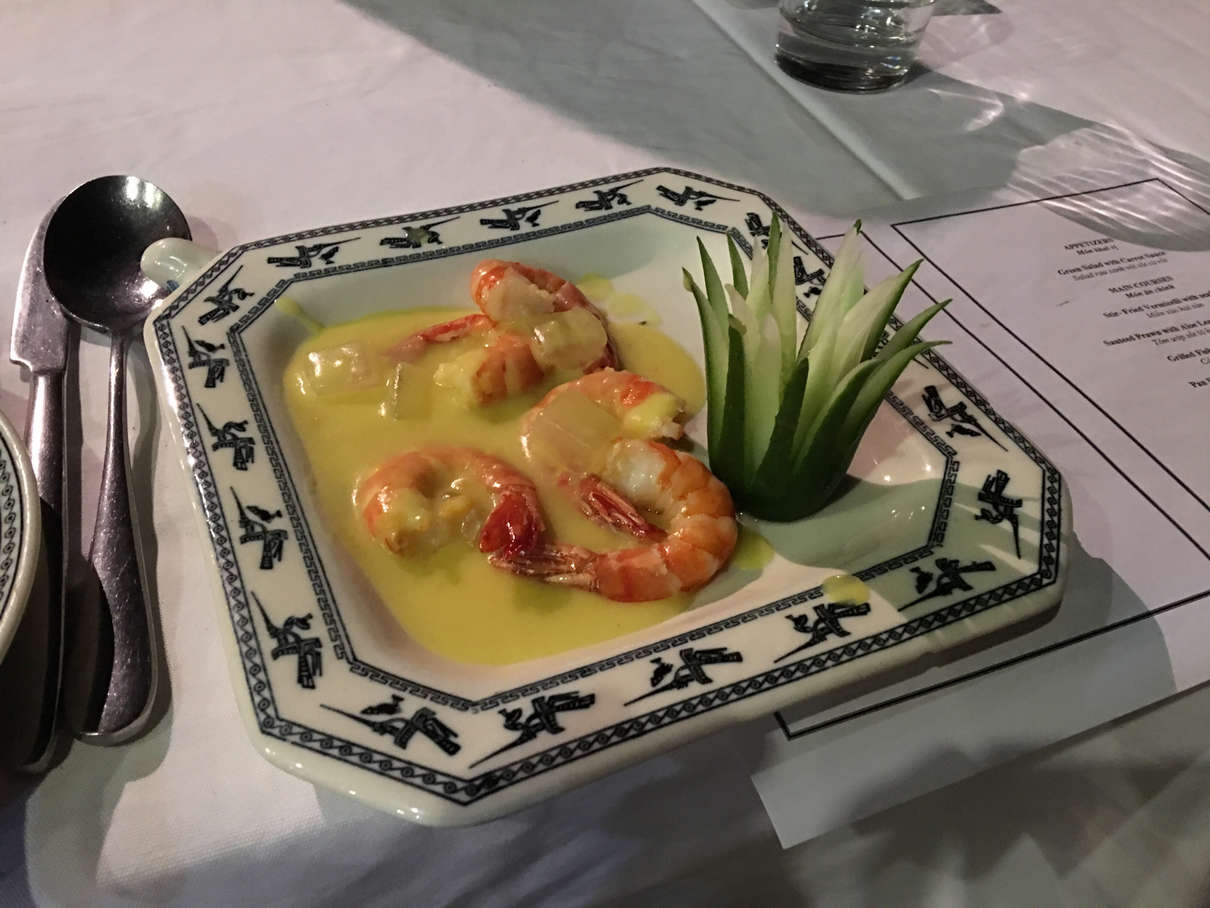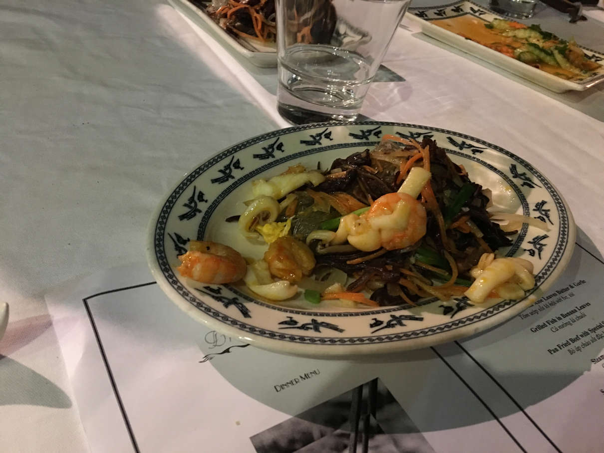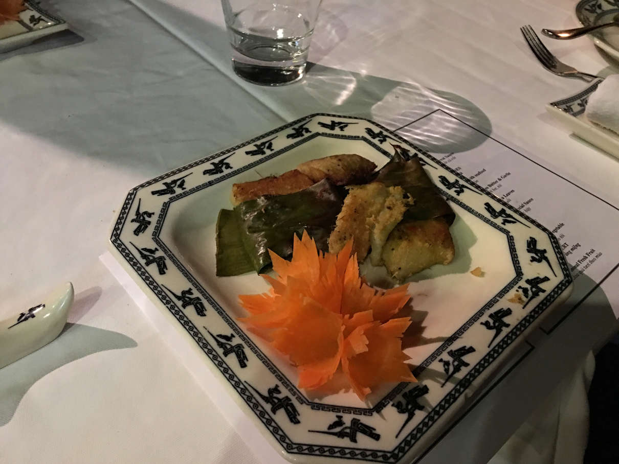 Before dinner, we were treated to a cooking lesson in how to make spring rolls by our chef, Mr. Bing. Dinner was the most filling meal yet on this cruise, consisting of salad, prawns with noodles, butter prawns, mackerel wrapped in banana leaf, seasonal greens, beef in special sauce and more fruit.