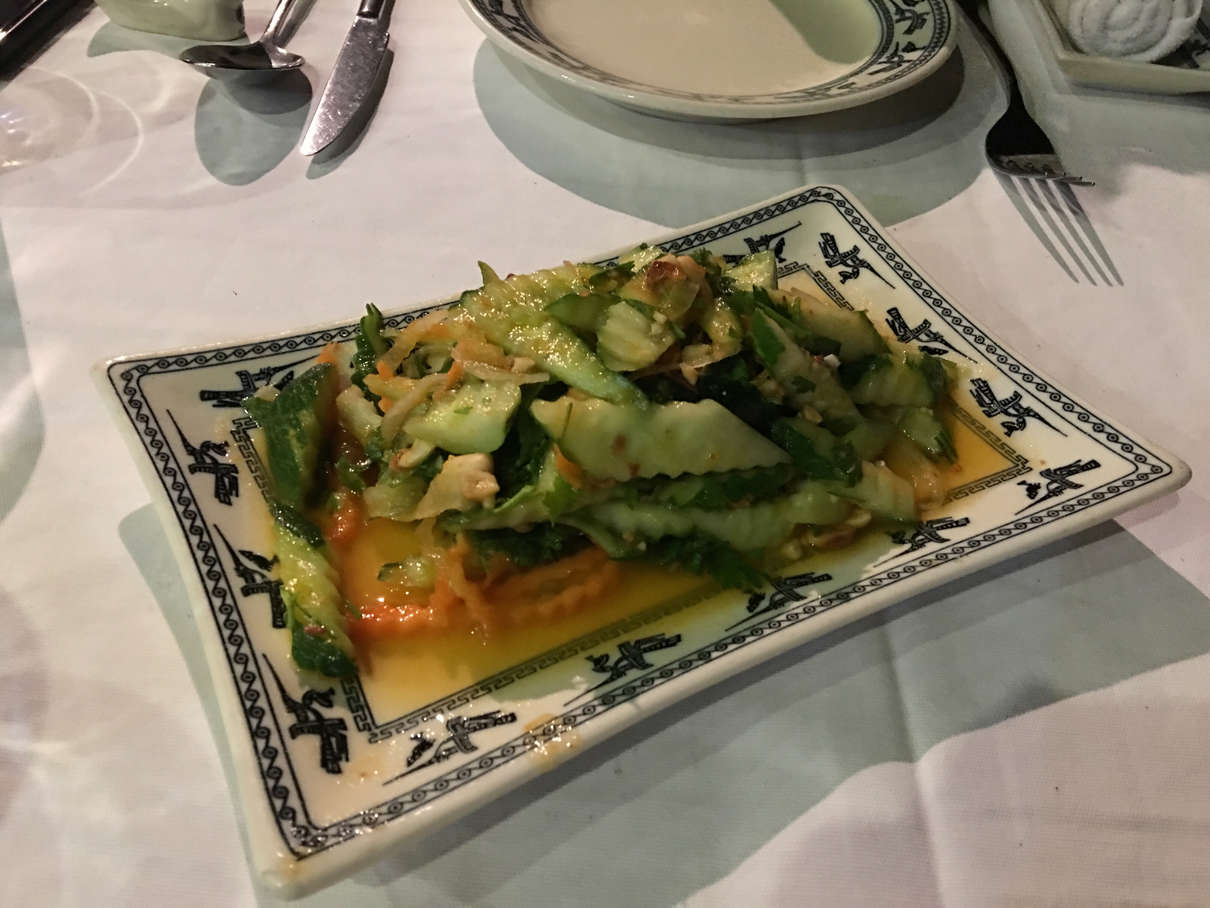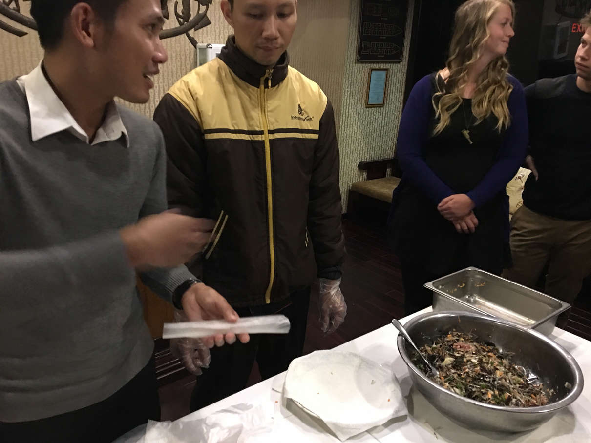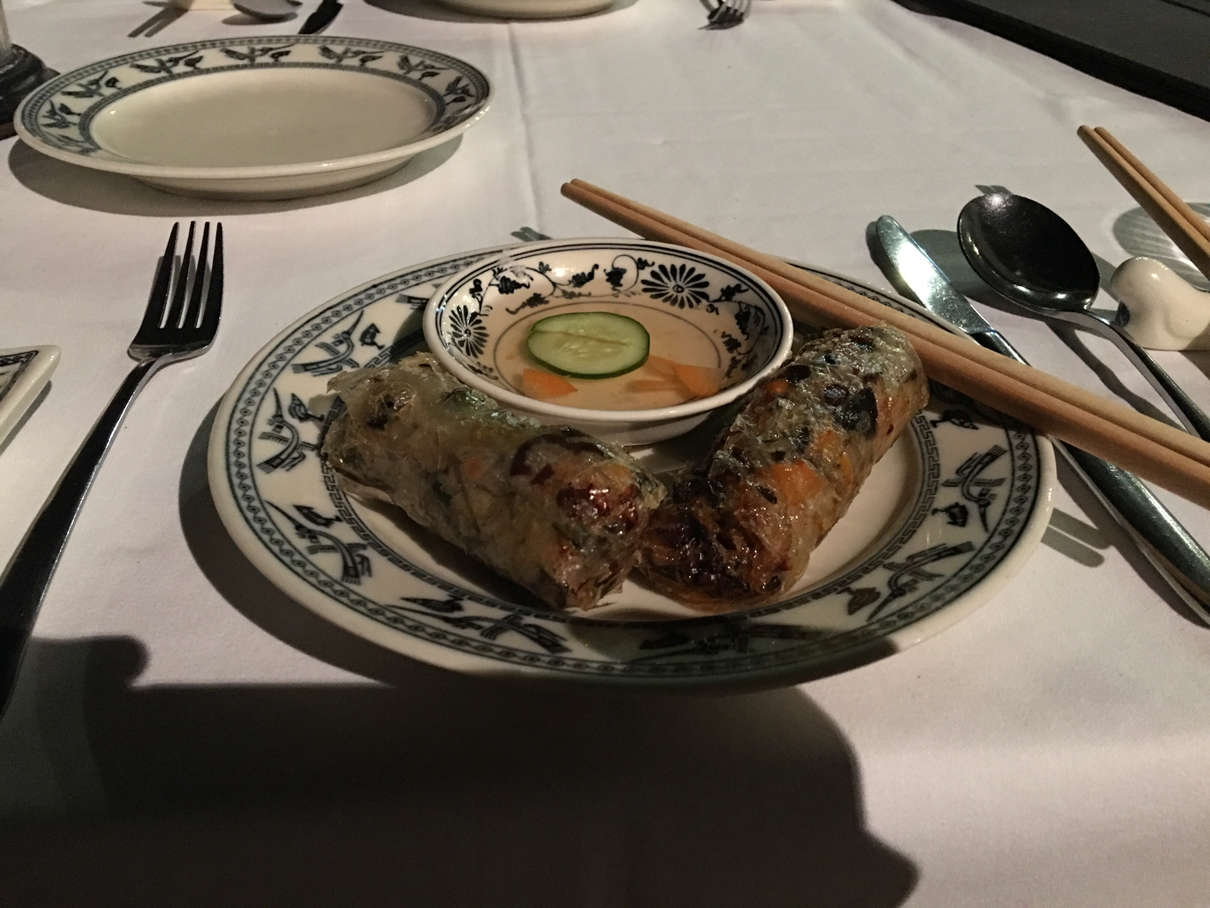 Before dinner, we were treated to a cooking lesson in how to make spring rolls by our chef, Mr. Bing. Dinner was the most filling meal yet on this cruise, consisting of salad, prawns with noodles, butter prawns, mackerel wrapped in banana leaf, seasonal greens, beef in special sauce and more fruit.