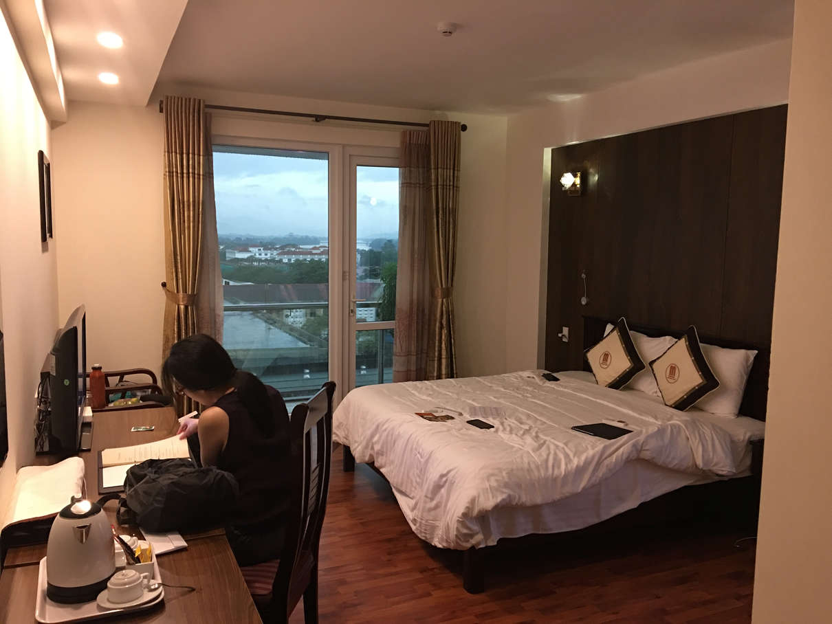 We checked in to our hotel, the Midtown Hue, a decidedly retro feeling hotel, and the best view we’ve had so far, the Perfume River shrouded in mist in the distance.