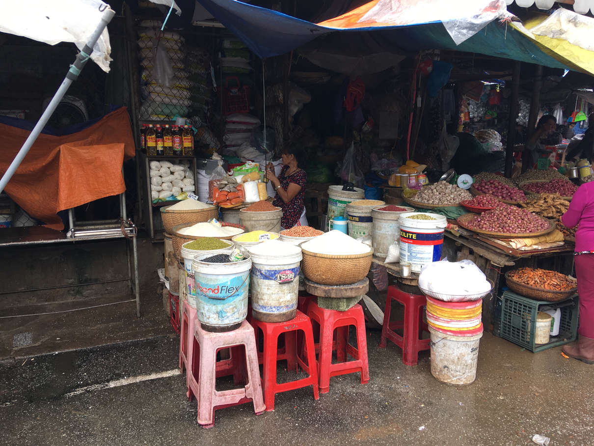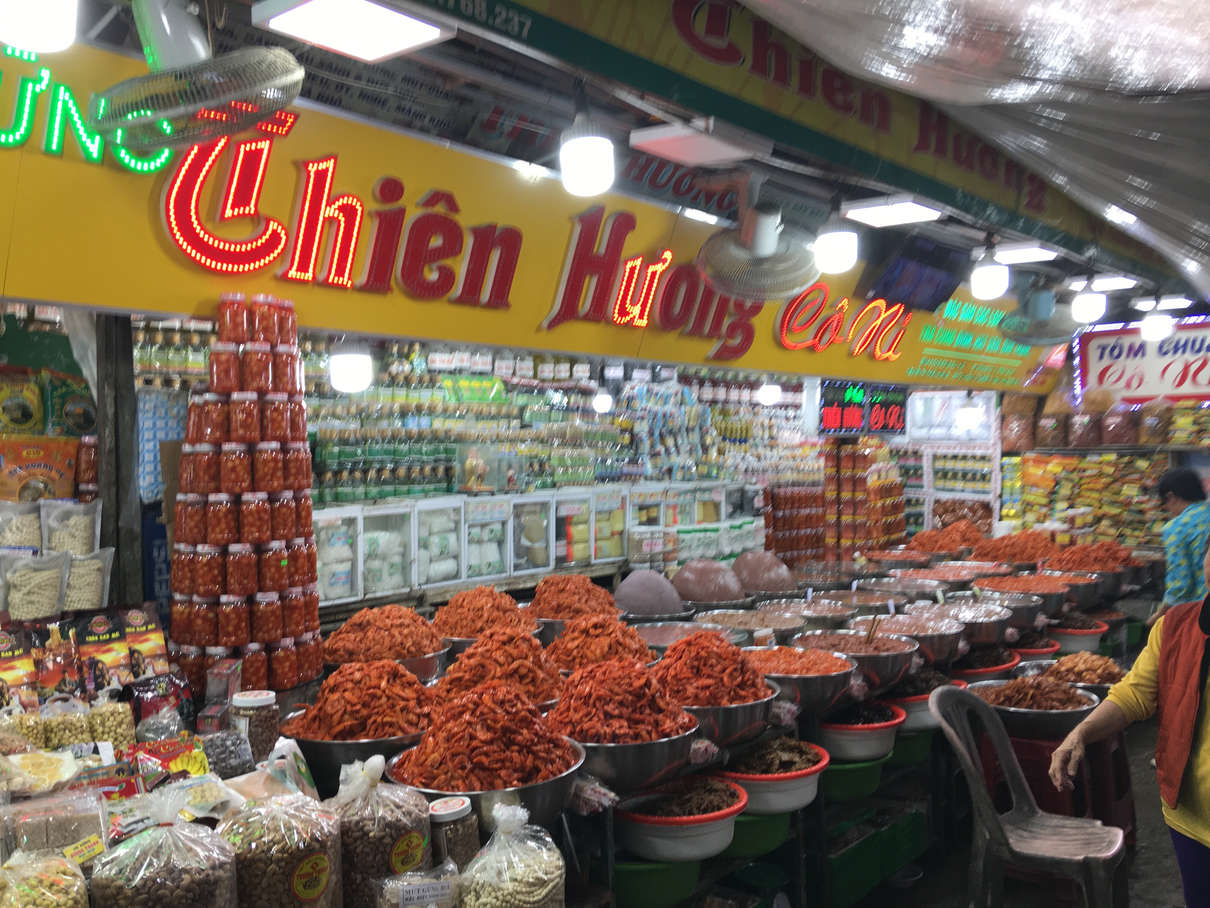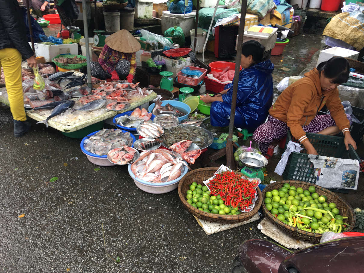 After the pagoda, we proceeded to Dong Ba market, taking a dragon boat down the Perfume River to get there. Lots of great looking produce there. One of the big things is raw shrimp in chili and garlic, numerous stalls sold this.