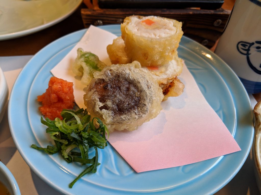 Fugu, mushroom, and shishito tempura